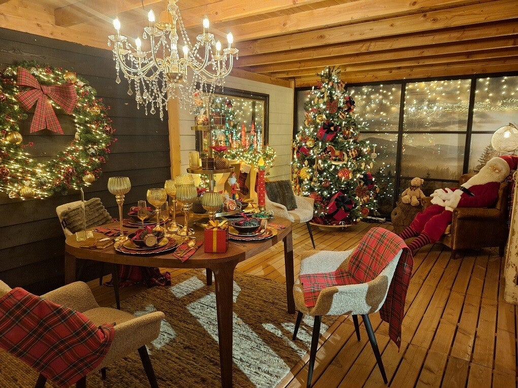 De kerstbeleving voert naar de prachtige en adembenemende veranda van de cottage, waar de kerstman net even een dutje doet bij de openhaard. De kerstsokken van de kerstman en zijn vrouw hangen al klaar, en de draaiende kerstboom is versierd met grote gouden kerstballen en mooie rode cadeautjes, en de eettafel is gedekt met een vrolijk kerstservies. De kerstman is er al helemaal voor!